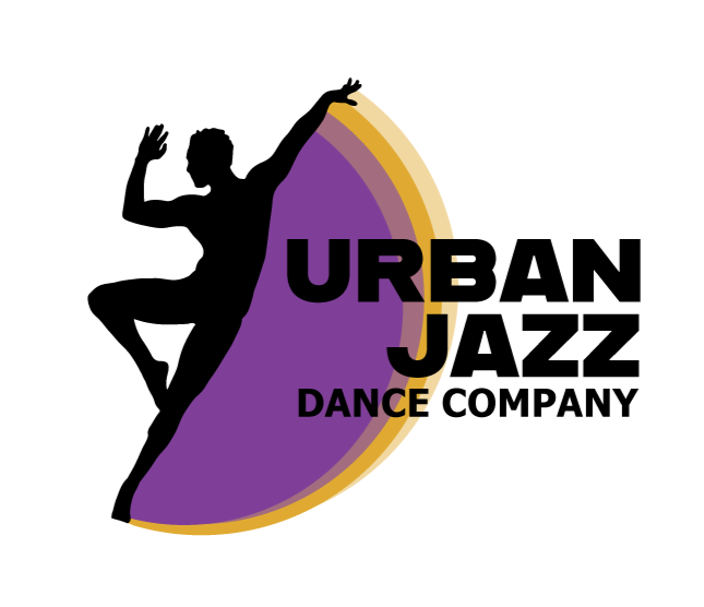 ID: The logo for Urban Jazz Dance Company- a silhouette of a black dancer stands to the left of the name in black, “Urban Jazz Dance Company” with a purple and yellow swoop behind the dancer silhouette. The Deaf Spotlight logo consists of three black spotlight outlines stacked upon one another with the name inside the spotlights in white.